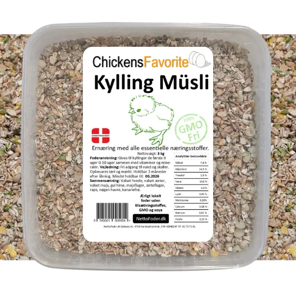 Leder du efter sundt og naturligt kyllingestart mysli til dine unge kyllinger? Vores kyllingestart mysli i bøtte er specielt udviklet til kyllinger i alderen 0 til 10 uger og er helt fri for piller, kunstige tilsætningsstoffer og unødige fyldstoffer. Kun ren konr- og frøgodhed.